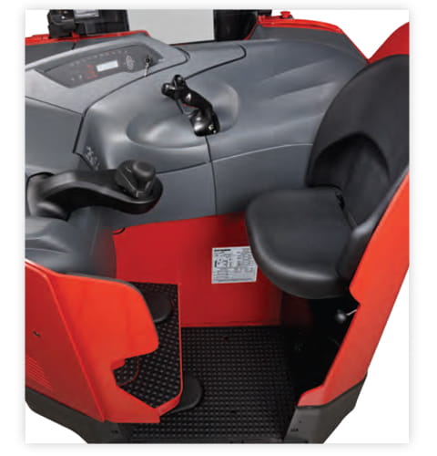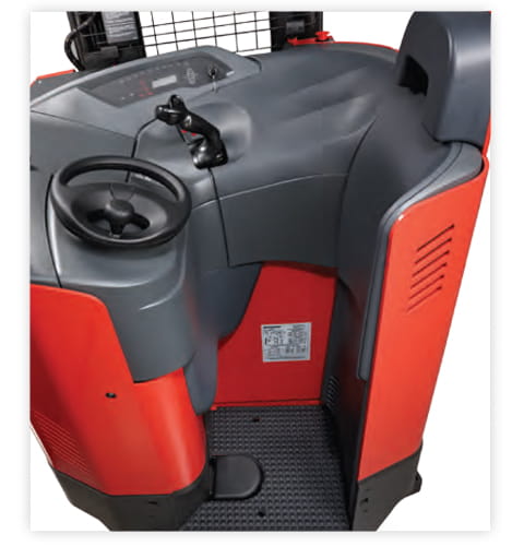 The universal stance reach truck allows the operator to look comfortably straight up while storing and retrieving loads. With the universal stance, the driver can face forward with an open view when handling and storing pallets, and face the direction of travel when moving tractor-first.